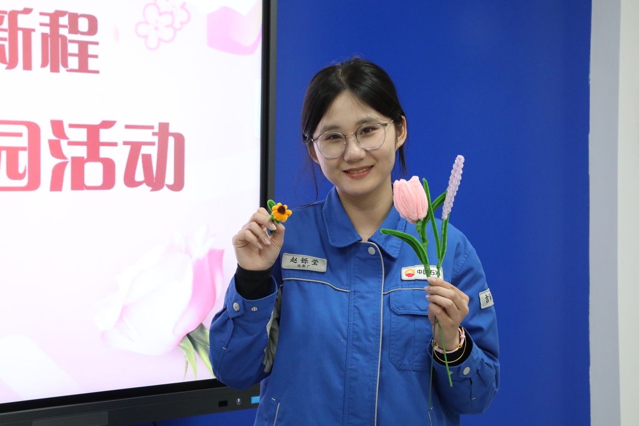 “注意花瓣弧度要自然,像这样把铁丝藏进花蕊……”在活动现场,女工委员孙宁手把手指导女工,只见她指尖翻飞,将淡紫色扭扭棒绕成优雅的弧形,铁丝固定时手腕轻抖,一片仿真露珠便缀在花瓣边缘。女工们纷纷拿出自己的创意,技师时念秋将橙黄扭扭棒拧成向日葵,内操陈晨则用渐变蓝创作出“海浪花”,安全工程师王芳特意在自己制作的花束上缠上写有“操作前思考30秒”的安全标语小丝带……