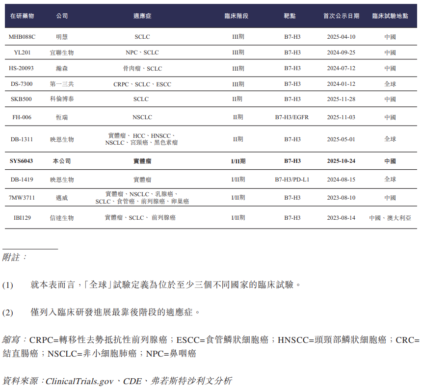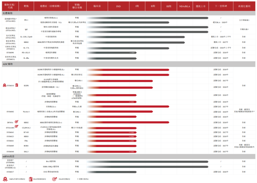公司当前的ADC管线战略性地聚焦于肺癌、乳腺癌、胃癌、结直肠癌(「CRC」)及食管鳞状细胞癌(「ESCC」)等发病率高或存在重大未满足临床需求的适应症。公司的创新在研ADC药物靶点覆盖EGFR、Nectin-4、HER2、CLDN18.2、B7-H3、HER3、FRα、ROR1及DLL3,其中SYS6010与SYS6002是公司的两款主要在研ADC药物。