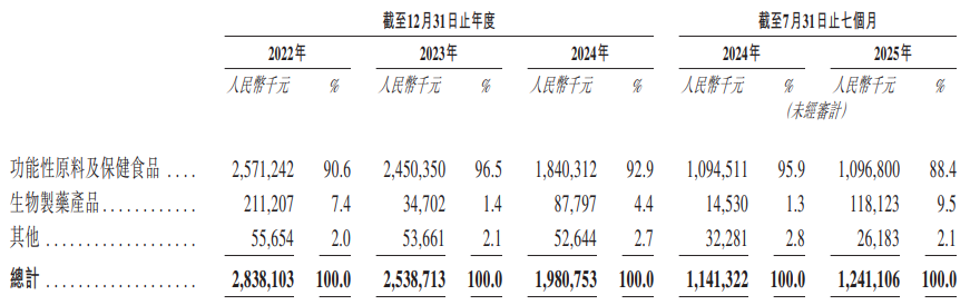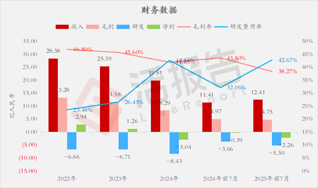 公司是专注于生物制药、功能性原料及保健食品的创新药企,2024年收入19.8亿元,净亏损3.04亿元;2025年前7月收入12.4亿元,净亏损2.26亿元,毛利率38.3%,研发费用率接近43%。