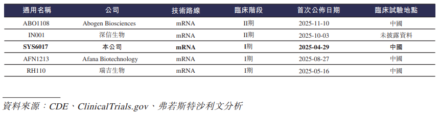 截至最后实际可行日期,全球有三款获批的预防性VZV疫苗,包括GSK的Shingrix®、SK集团的SKYZoster及长春百克生物科技的感维®,均非mRNA疫苗。截至同日,全球共有五款预防性mRNA VZV在研疫苗正处于临床开发阶段,其中三款在研疫苗处于I期试验阶段及两款在研疫苗处于II期试验阶段。
