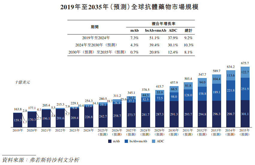 根据弗若斯特沙利文(Frost & Sullivan)报告,全球抗体药物市场的规模从2019年的1,638亿美元增长至2024年的2,543亿美元,复合年增长率达到9.2%。预计将进一步扩大至2030年的4,579亿美元及2035年的6,757亿美元,2024年至2030年的复合年增长率为10.3%,2030年至2035年的复合年增长率为8.1%。